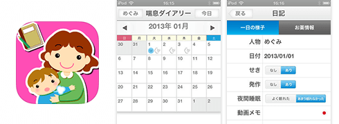 アストラゼネカと共同開発した、喘息のお子さんとママ・パパが、喘息のコントロール状況や服薬・受診日を管理できるぜんそく治療お役立ちアプリ。服薬時間と受診日のお知らせ機能やお子さんが遊べるじゃんけんゲームも。