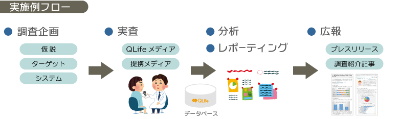 医療に特化したメディアの強みを生かし、患者・生活者や医療従事者(医師・看護師・薬剤師)を対象とした調査の企画から実施、分析、レポーティング、広報(プレスリリース、調査紹介記事公開)を行っています。