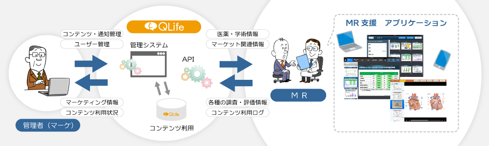 QLifeは、医師、薬剤師、看護師などの医療従事者に向けて、医療従事者専用サイト「QLifePro」を中心に様々なサイト、アプリ、サービスを開発・運営しています。これら医療従事者との接点を活用したマーケティング支援を行っています。